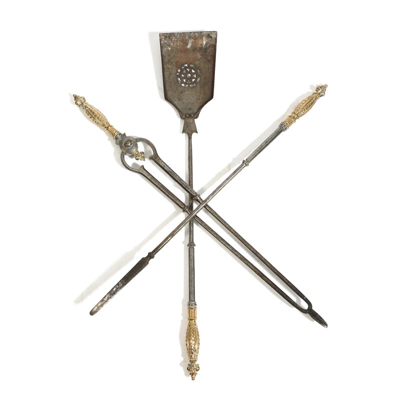 A set of three Victorian steel fire tools, each with a gilt bronze handle, stamped with a registration lozenge, with knopped stems and a pierced pan, 79.5cm long. (3)
