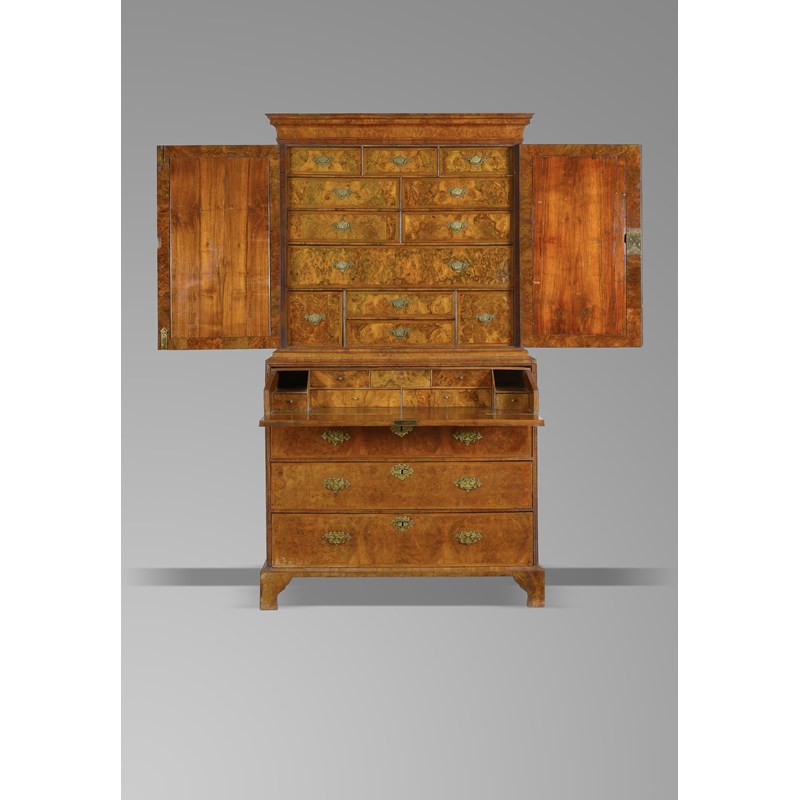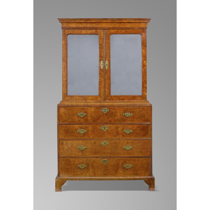 A George II burr walnut secretaire cabinet, the moulded cornice above a pair of arched mirrored panelled doors, enclosing twelve feather banded drawers, above a secretaire drawer, fitted with pigeon holes and further drawers, above three long drawers and bracket feet, 194.7cm high, 111.3cm wide, 54.5cm deep.