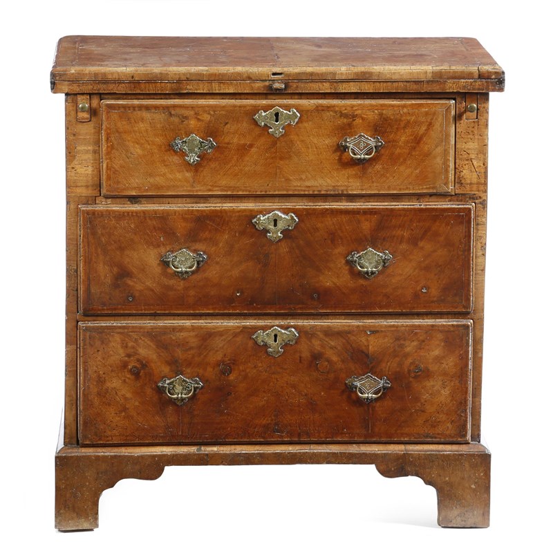 An early 18th century walnut bachelor's chest, the quarter veneered hinged fold-over top with cross and feather banding, above three long drawers, on bracket feet, 80.9cm high, 76cm wide, 37cm deep.