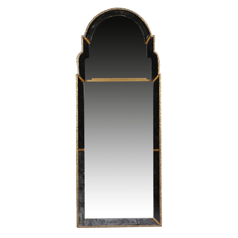 A Queen Anne and later giltwood pier mirror, with a divided arched plate, with a black glass outer border and a leaf carved frame, 164.7 x 64.4cm.