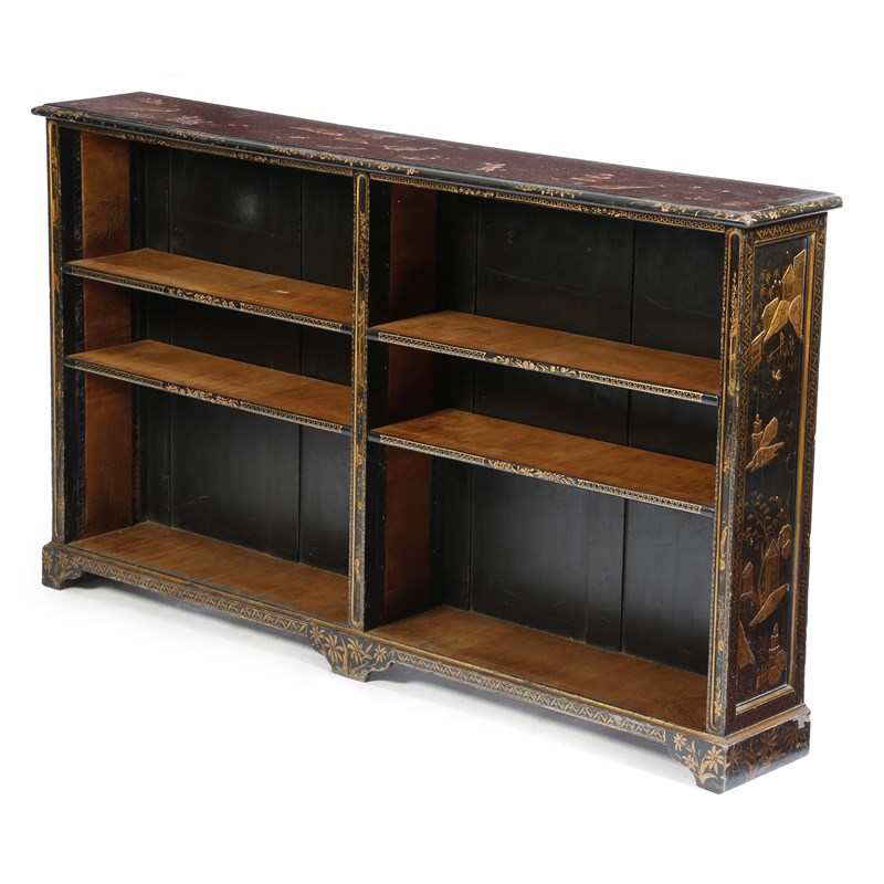 A black and gilt lacquered open bookcase, decorated with chinoiserie, with figures, birds and pagodas, with four adjustable shelves, early 20th century, 81.7cm high, 139.7cm wide, 23.2cm deep.