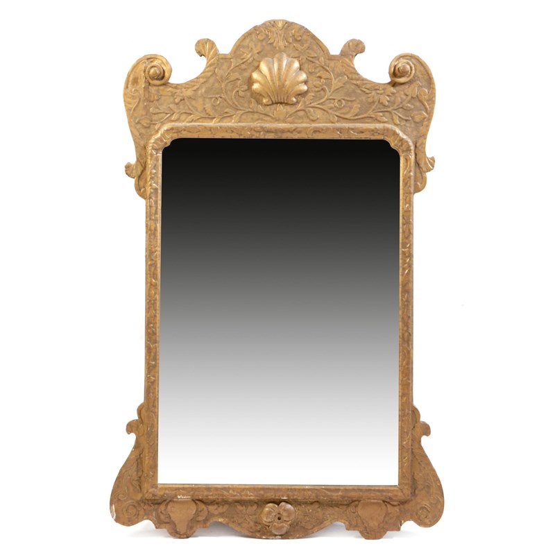 A George I giltwood wall mirror, the later bevelled plate in a leaf decorated frame, the top with a shell, the base with a flowerhead, originally with sconces, 104.8 x 67.5cm.