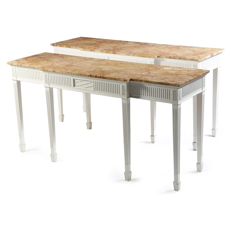 A pair of white painted breakfront side tables in George III style by John Sander, each with a faux marble top, above a fluted and lattice panelled frieze, on square tapering legs and spade feet, c.1966, 84cm high, 168.4cm wide, 54.5cm deep. (2)