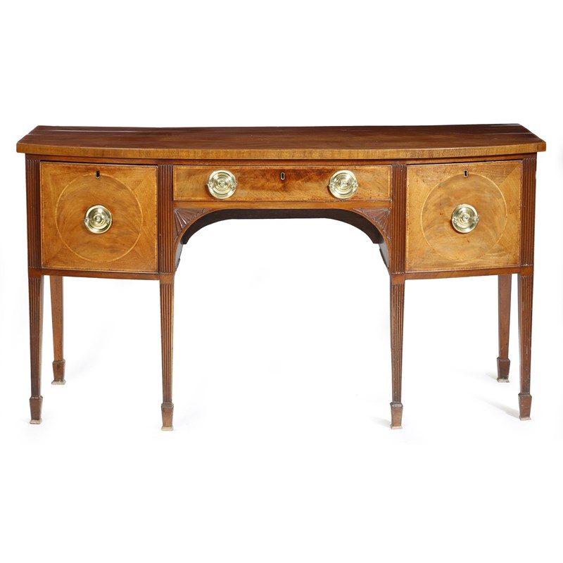 λ A Regency mahogany bowfront sideboard, with rosewood banding, the top originally with a rail, above a frieze drawer flanked by two deep drawers, one with divisions for bottles, the other with a lift-out cutlery tray, with reeded square tapering legs and fan spandrels, with a plate glass top, 91.7cm high, 167.7cm wide, 69.2cm deep.