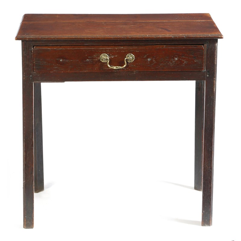 A George III oak side table, with a frieze drawer and on moulded and chamfered legs, 72.7cm high, 73.5cm wide, 44.5cm deep.