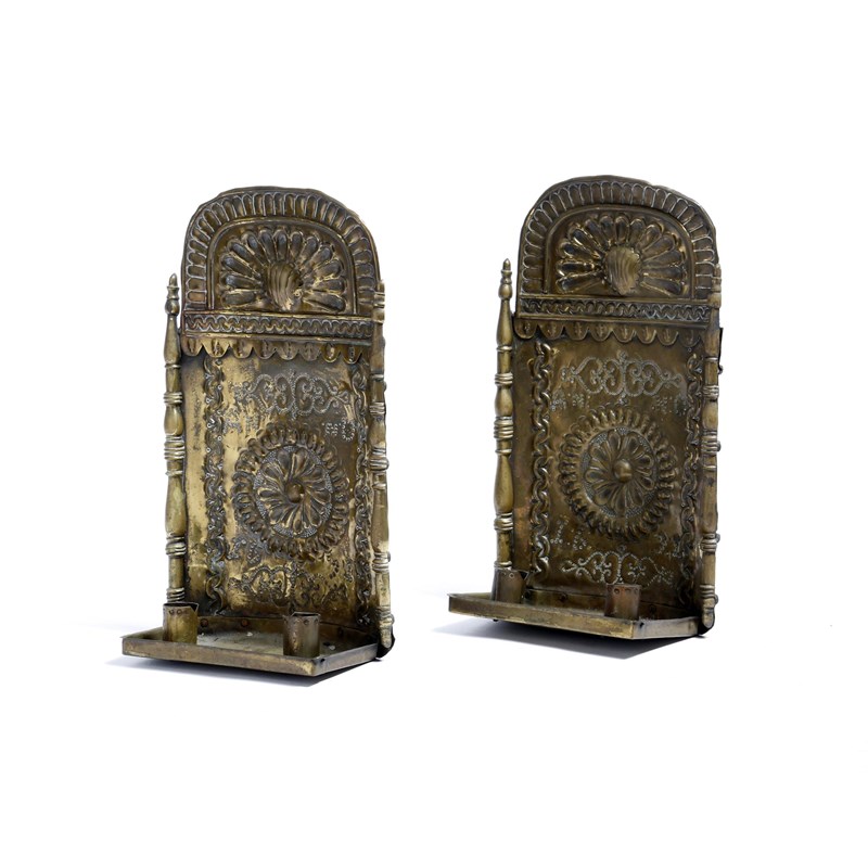 A pair of late 17th century sheet brass wall sconces, each with repousse decoration and with cast baluster turned pillars, dated 'ANNO 1691' and with twin candleholders, 34.3cm high. (2)