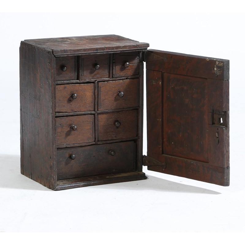 A William and Mary oak spice cupboard, the geometric moulded panelled door enclosing an arrangement of eight drawers, 36.4cm high, 28cm wide, 19.5cm deep.