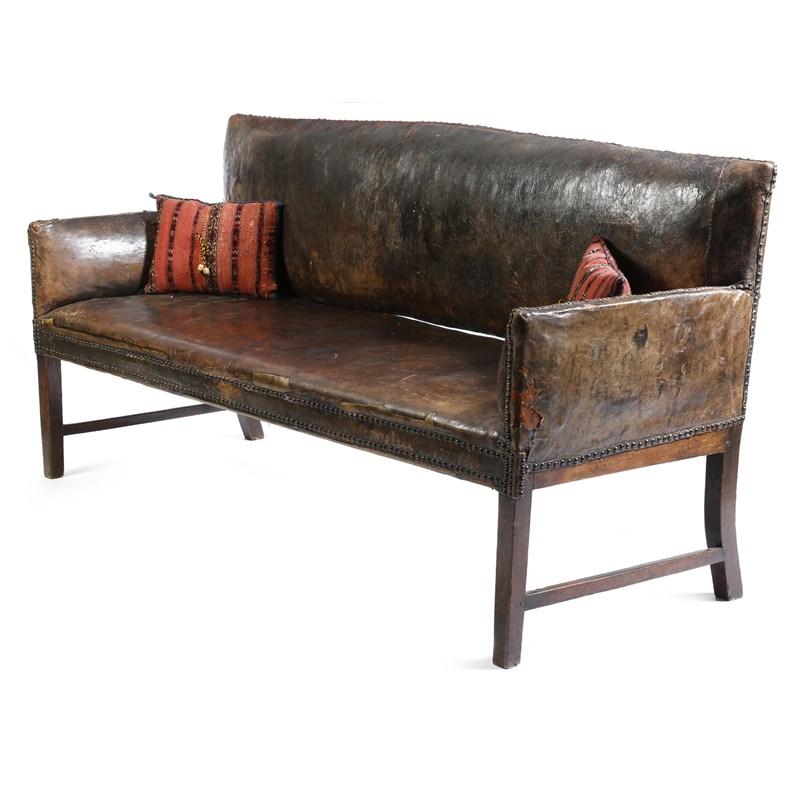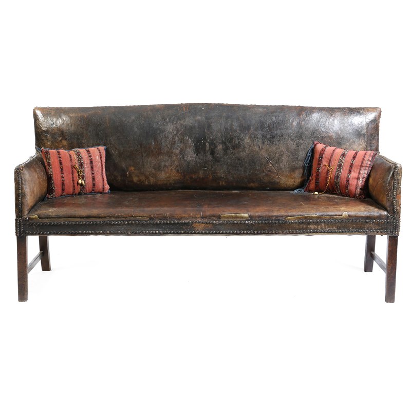 A George III settee, upholstered with brass studded distressed brown leather, on mahogany legs with side stretchers, with a pair of scatter cushions, 96.5cm high, 194cm wide, 68.8cm deep.