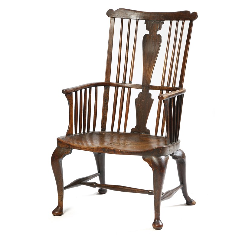 A mid-18th century fruitwood and ash Windsor armchair attributed to John Pitt, the comb back above a solid vase shape splat, with concave arm supports, above a solid elm seat, on cabriole legs and pad feet united by turned stretchers.