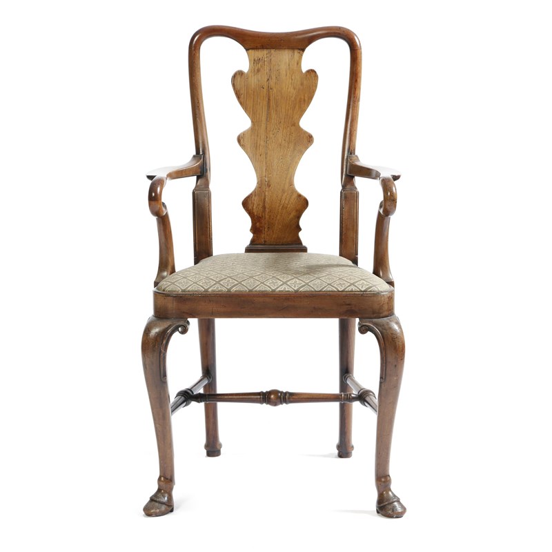 A walnut open armchair in George II style, with a shaped solid splat, with shepherd's crook arms, above a drop-in seat, with cabriole front legs and hoof feet.