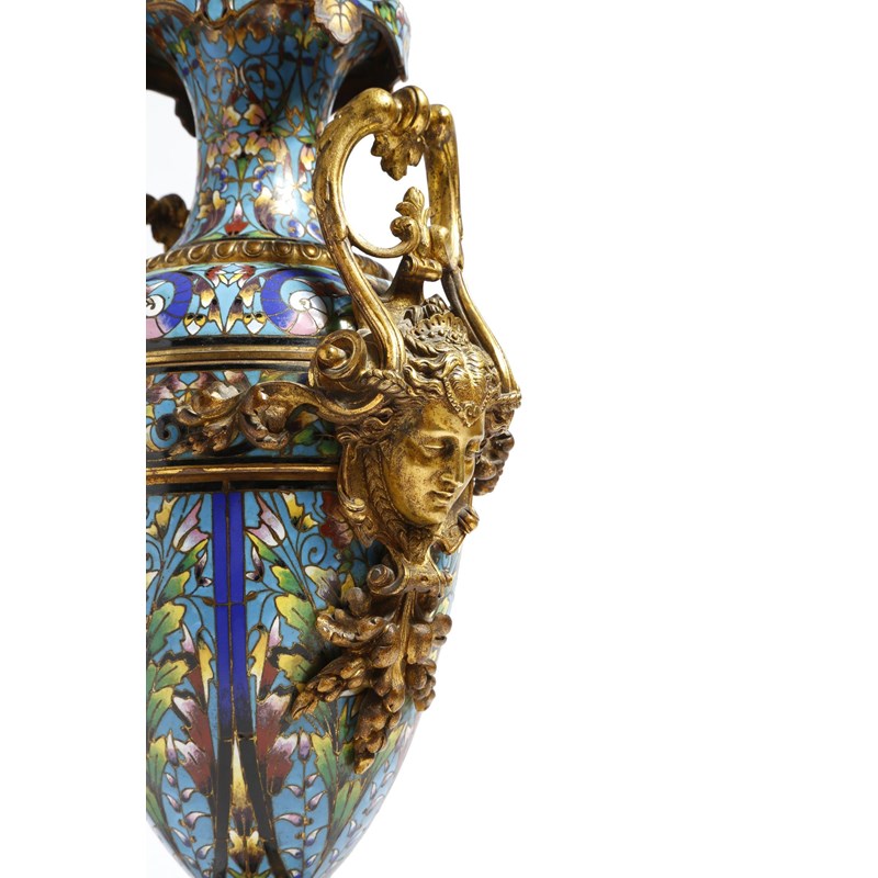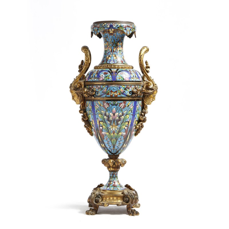A late 19th century French ormolu and champleve enamel urn