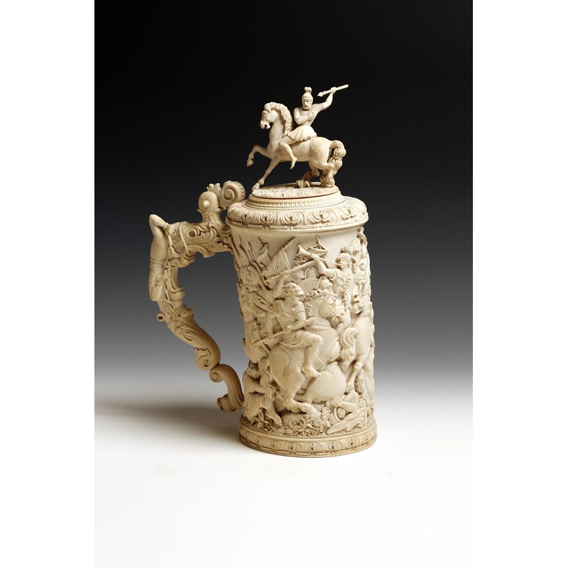 λ A fine and large late 19th century German carved ivory lidded tankard