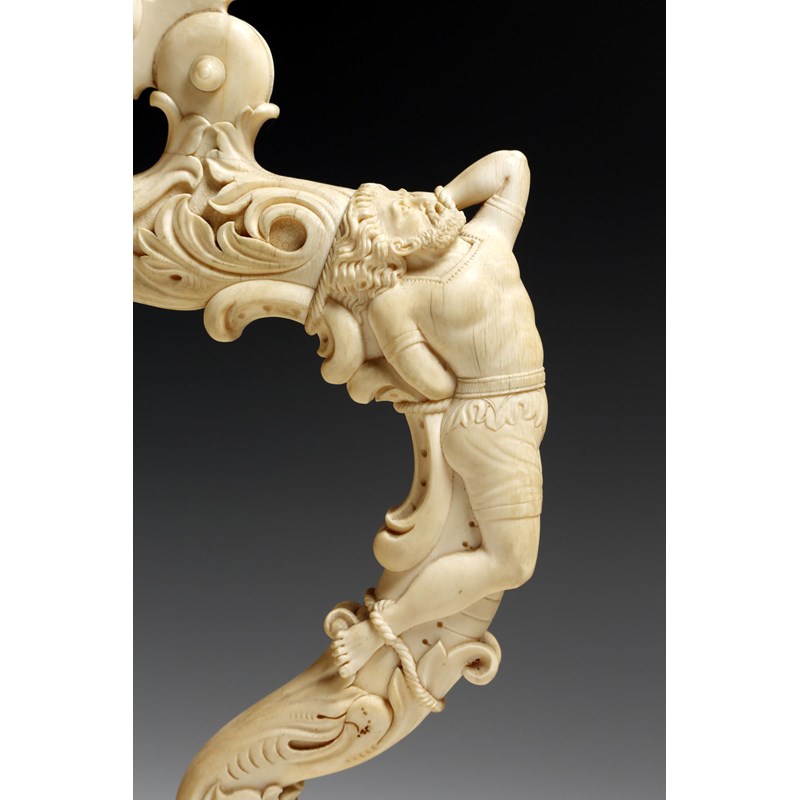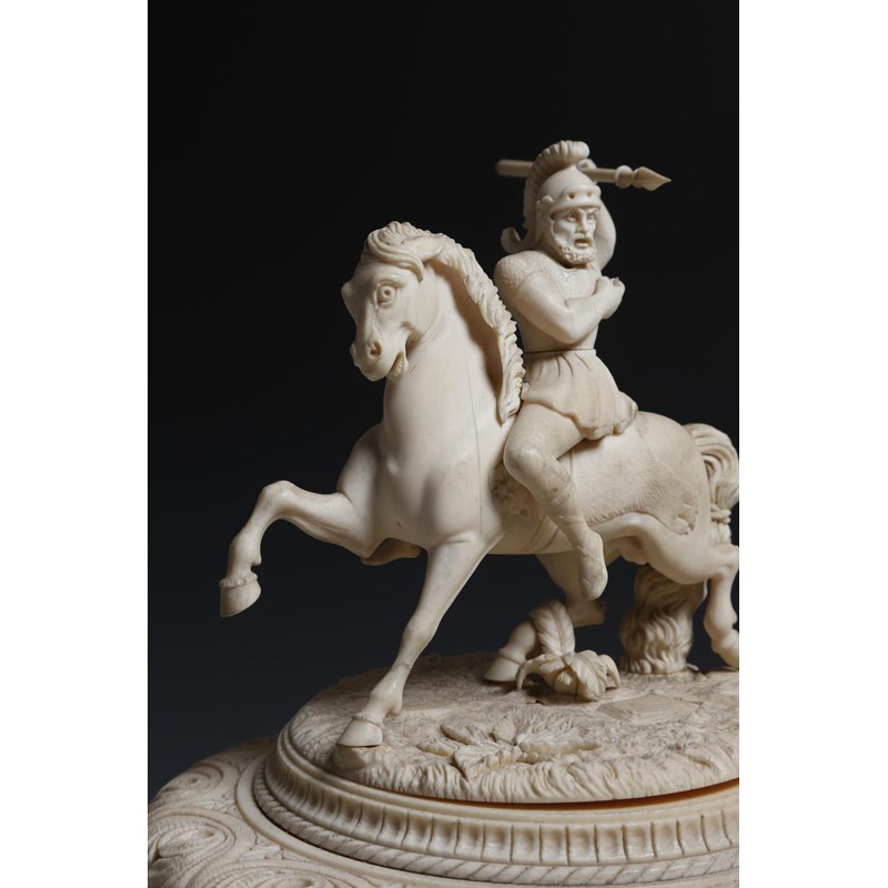 λ A fine and large late 19th century German carved ivory lidded tankard, probably Erbach, the finial carved with a warrior on horseback about to throw his spear, above a leaf carved moulding, the body finely relief carved with a continuous classical battle scene, possibly the battle of Issus with Alexander the Great on horseback, the scroll handle carved with a bound captive and a lion's mask, 37.8cm high.