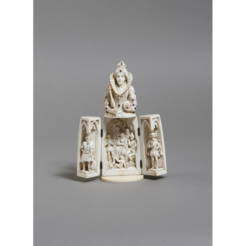 λ A late 19th century French Dieppe carved ivory and jewelled triptych figure of a Queen