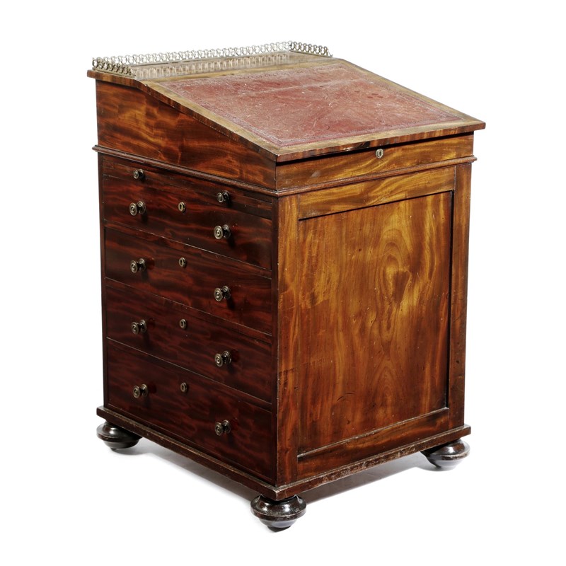 A George IV mahogany Davenport in the manner of Gillows, the sliding top with a brass gallery, above a hinged leather lined writing slope, revealing a drawer and a secret drawer, the right side with a hinged pull-out inkwell and pen compartment, above four long graduated drawers, the left side with a pull-out leather lined slide, on sunken brass castors, 86.3cm high, 57.5cm wide, 62.5cm deep.
