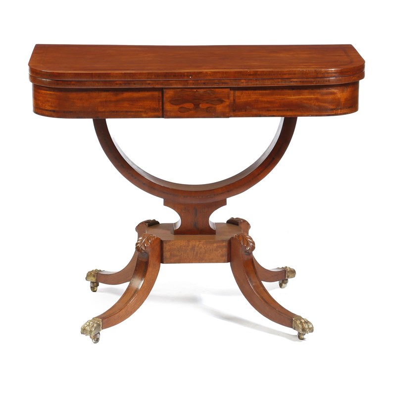 A Regency mahogany card table, inlaid with banding, the 'D'-shaped swivel and fold-over top on a 'U'-shaped support, on leaf carved hipped legs and brass lion's paw sabot and castors, 76.8cm high, 91.8cm wide, 45.5cm deep.
