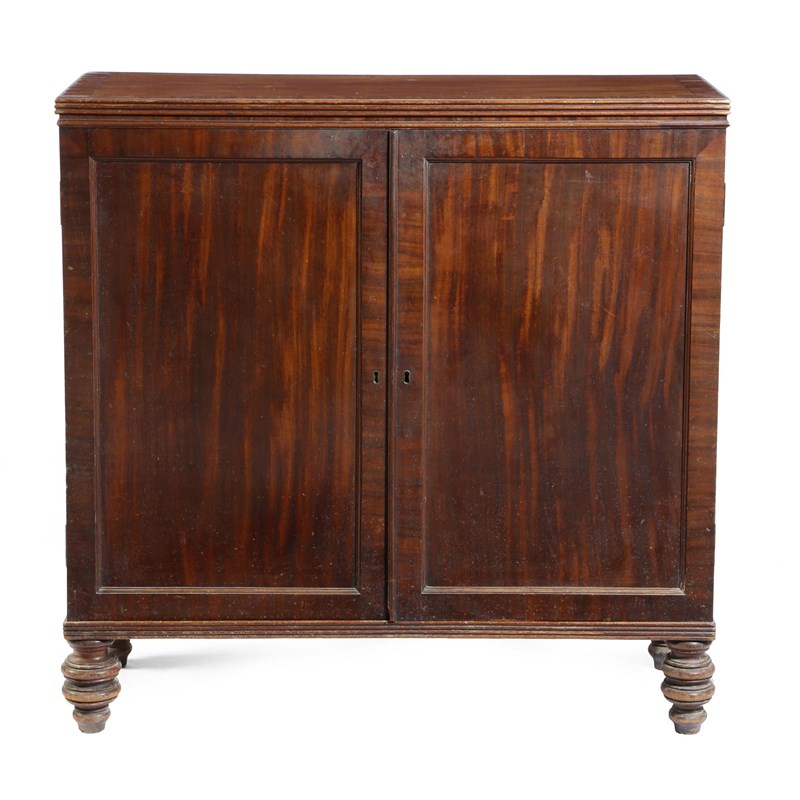 A Regency mahogany side cabinet, the crossbanded top with a reeded edge, above a pair of panelled doors enclosing three shelves, 91.2cm high, 92.5cm wide, 35.8cm deep.