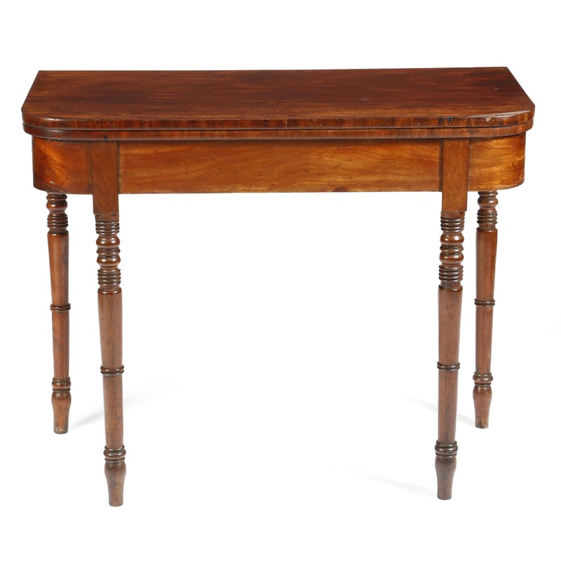 A Regency mahogany 'D' shaped card table, on ring turned tapering legs, 73cm high, 91.6cm wide, 45.2cm deep.