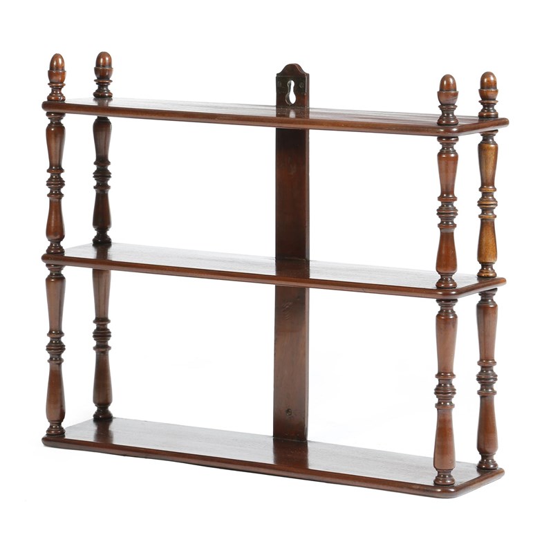 A set of Regency mahogany hanging wall shelves, with acorn finials and turned supports, 57cm high, 68cm wide, 15.6cm deep.