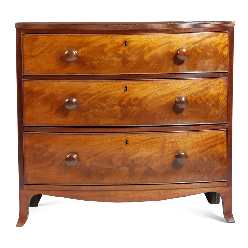 A Regency mahogany bowfront chest, the top with a reeded edge, above three long graduated drawers, 85.3cm high, 92.5cm wide, 47.5cm deep.