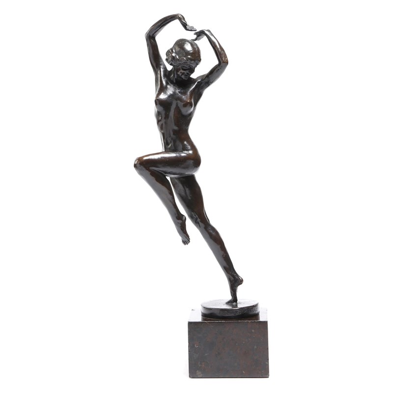 ‡ Renee Baronin von Vranyczany (German, 1879-1958). 'Tanzerin' an early 20th century bronze figure of a dancing female nude, the base signed R. VRANYCZANY (No 2), with a Valsuani foundry mark, on a serpentine plinth, 46cm high.