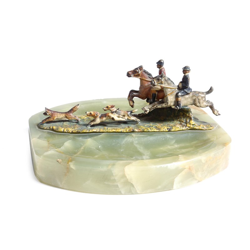 An Austrian cold painted bronze hunting group, of two horses and riders, with dogs chasing a fox, mounted on an onyx base, early to mid-20th century, 14.5cm wide.