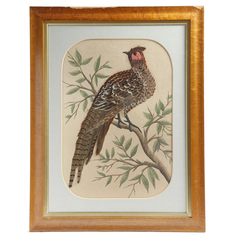 A Victorian bird feather picture of a pheasant, perched on a painted branch, with a glass eye, 49 x 33.5cm, in a later glazed bird's eye maple frame.