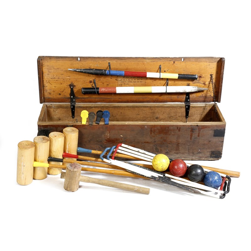 A croquet set, comprising: four ash mallets, marker posts, hoops and balls, in a pine box, the lid inscribed 'CLUB CROQUET'.