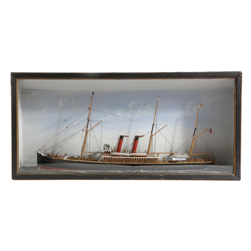 A Victorian painted wood ship diorama, depicting a steam ship 'STANLEY', with a painted cloud background and a naturalistic sea, in a glazed gilt and ebonised case, 41cm high, 86.5cm wide.