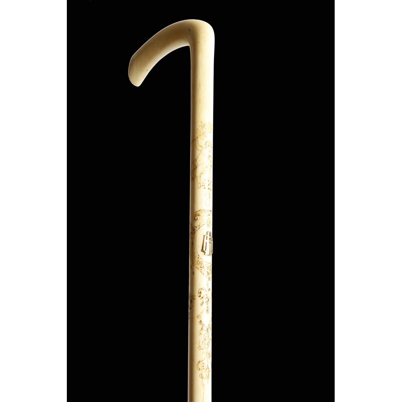 λ A late Victorian ivory and penwork walking cane, with an applied gilt metal monogram 'HH' and engraved with cherubs and ribbon tied flowers and a lady holding a lamp, 88.5cm long.