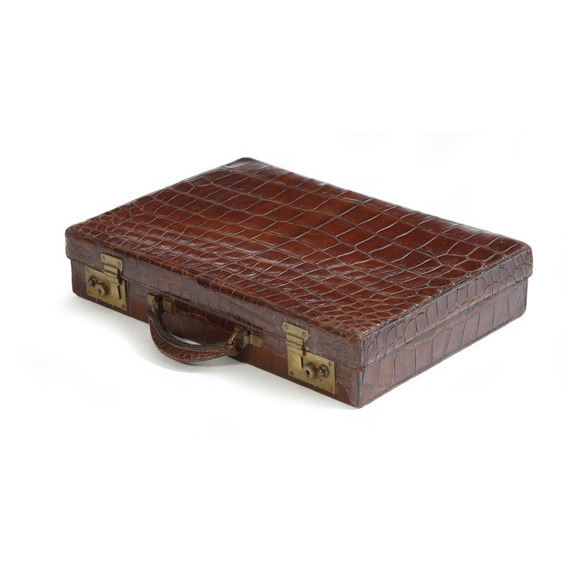 λ An early 20th century French crocodile leather briefcase, with brass locks and stamped in gilt 'E. PINTEAUX 62 RUE DE TURBIGO PARIS', the interior with a letter pouch, 33 x 47.8cm.
