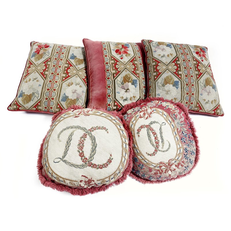 Two needlework cushions, formerly seat covers, worked with a ribbon tied cartouche with interlaced initials 'D C', together with three tapestry and velvet cushions, 53cm wide. (5)