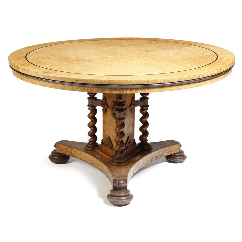 A Victorian oak breakfast table, the faded circular crossbanded tilt-top inlaid with ebonised stringing, on a triform stem with applied strapwork decoration and three spiral twist columns, on a platform based disc feet and sunken brass castors, 73.9cm high, 127cm diameter.