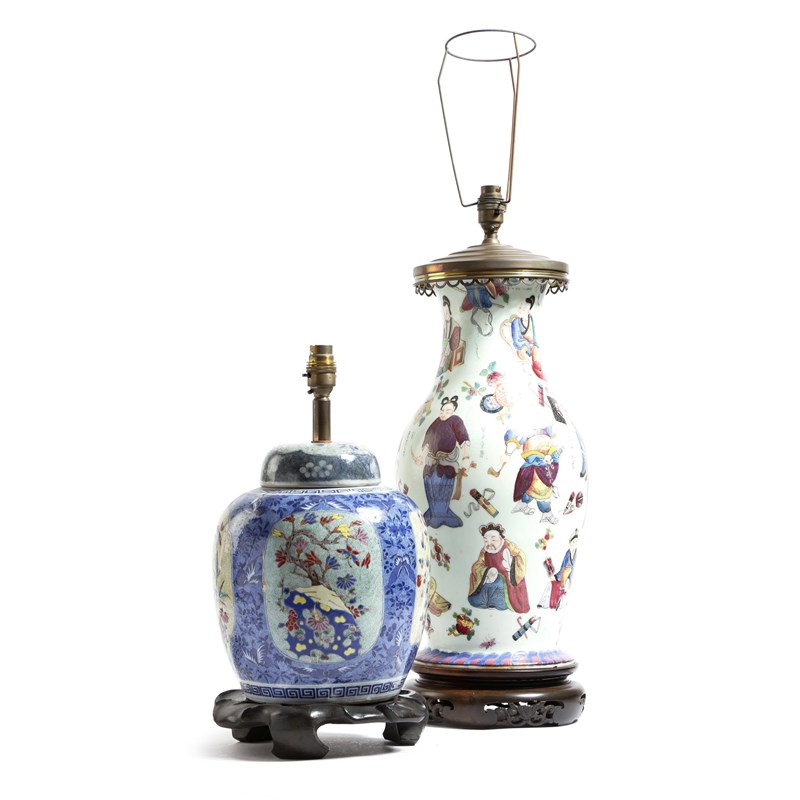 An oriental delcalcomania style baluster vase table lamp, decorated with Chinese figures, on a carved wood base, together with a Chinese porcelain ginger jar table lamp, decorated with panels of trees, flowers and butterflies, 55.6cm high (excluding fittings). (2)
