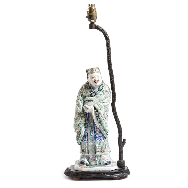 A Chinese porcelain figural table lamp, in the form of an immortal Zhang Guo Lao, mounted on a wooden plinth and with a naturalistic bronzed fitting, 48.7cm high.