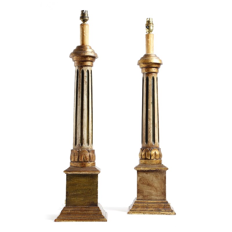 A pair of painted and giltwood column table lamps, of fluted form, on a stepped plinth base, 67.7cm high (excluding fittings). (2)