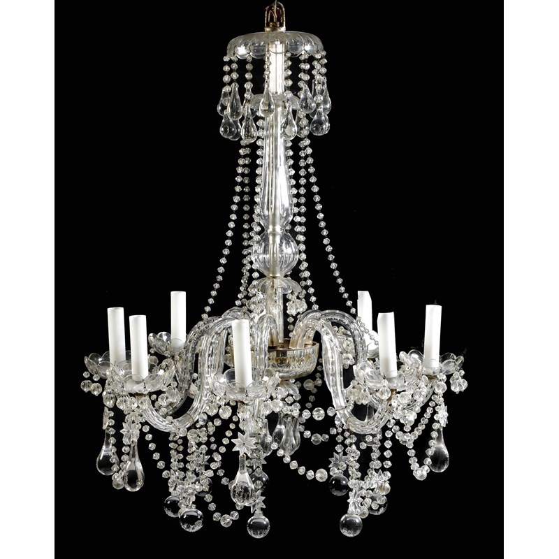 A Victorian cut glass eight-light chandelier, hung with pear, apple and diamond shape drops and with star prunts, the baluster and ball stem, with scroll arms and petal shape drip-pans, 91cm high, 69.5cm wide.