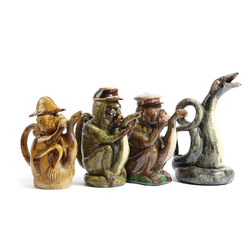 Three Portuguese majolica Palissy style pottery teapots, in the form of monkeys, sporting hats and sitting astride on a snake, one with impressed marks, together with a similar snake jug, with impressed marks for 'M. MAFRA CALDAO', late 19th / early 20th century, 33.8cm high (max). (4)
