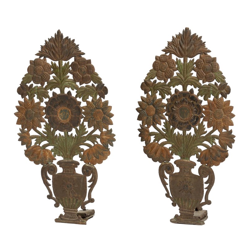 A pair of French tôle peinte fire side ornaments, in the form of an urn, issuing leaves, 59cm high. (2)