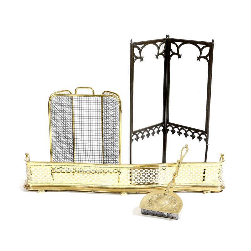 A Victorian brass serpentine fender, with pierced lattice decoration, a brass and wirework triptych fireguard, a bronze and glass Gothic style folding firescreen and a brass warming pan, repousse decorated with a pair of lions flanking a coat of arms, 126cm (max). (4)