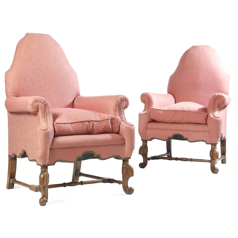 A pair of walnut wing armchairs in William & Mary style, each with studded pink upholstery, on cabriole front legs united by stretchers. (2)