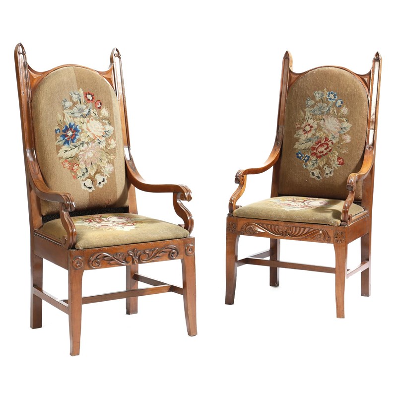 Two similar 19th century continental fruitwood Gothic armchairs, each with a padded needlework back and seat. (2)