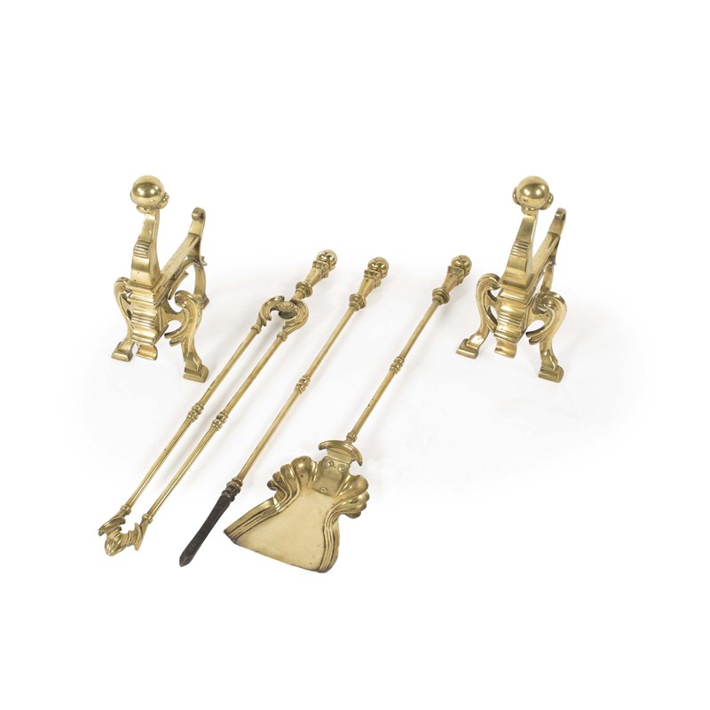 A set of three late Victorian brass fire tools, each with a stylized acorn finial and square tapering handle, together with a pair of matching andirons, the shovel: 28.75in (73cm) l. (5)