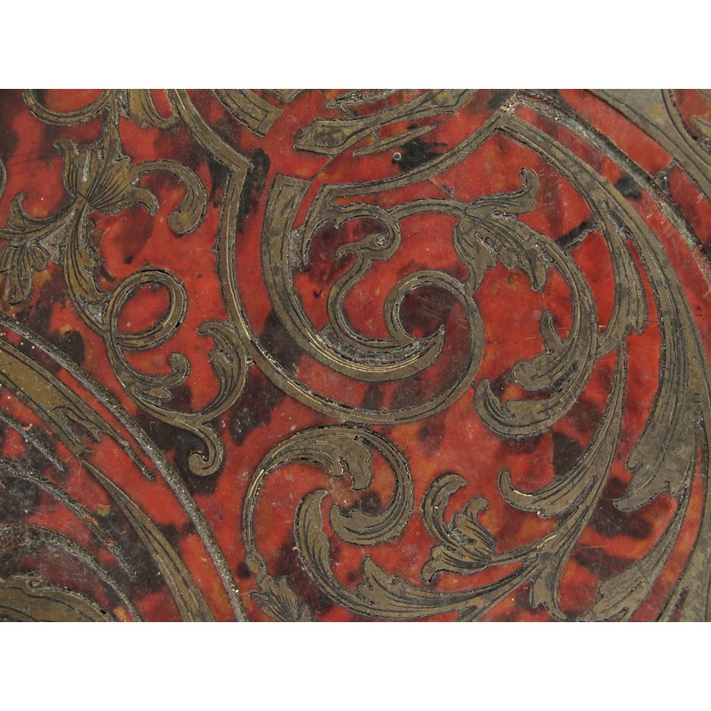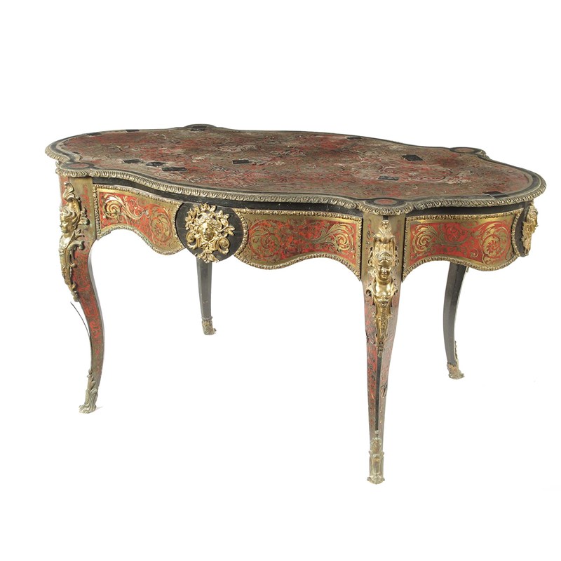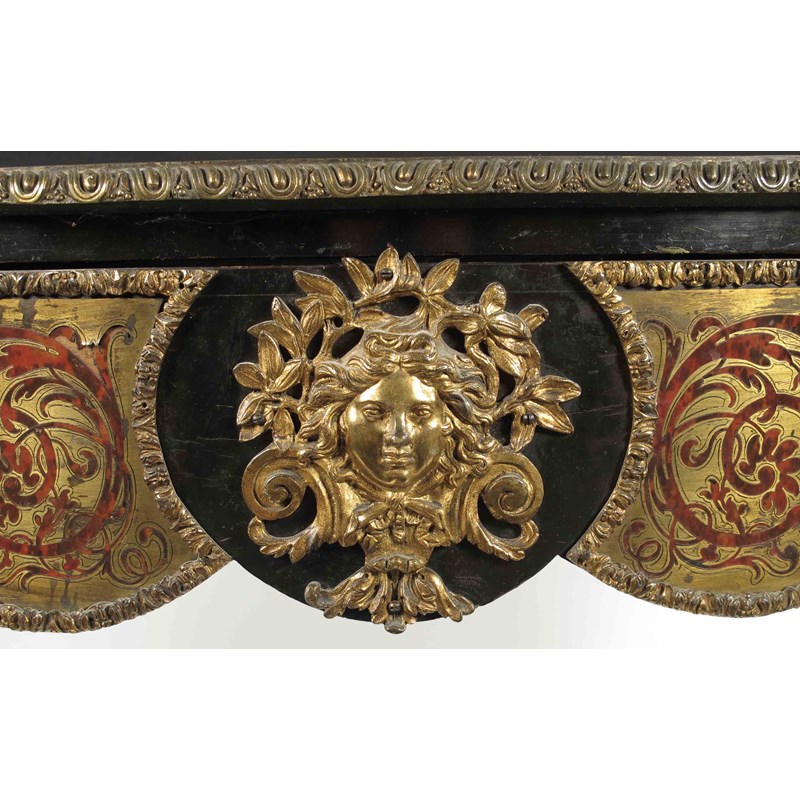 A Napoleon III ebonised, boulle marquetry and gilt metal mounted centre table in Louis XIV style, the serpentine moulded gadrooned edge top with foliate strapwork, above a frieze drawer centred an apollo mask on cabriole legs with espagnolette mounts terminating in foliate sabots, 29.5in (75.2cm) h, 60.5in (153.6cm) w, 33in (83.5cm) d. Brass lifting in places with losses, in need of restoration.