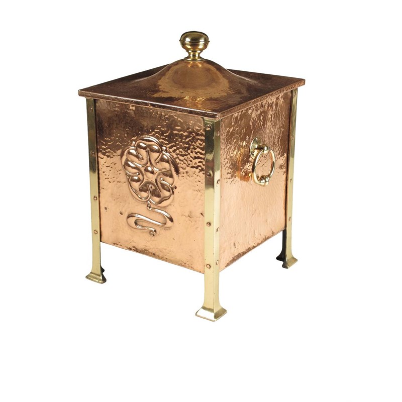 A hammered copper square coal bin, the front embossed a stylized rose, side handles, brass legs and a domed cover, 18.5in (47cm) h, 11.75in (30cm) sq.