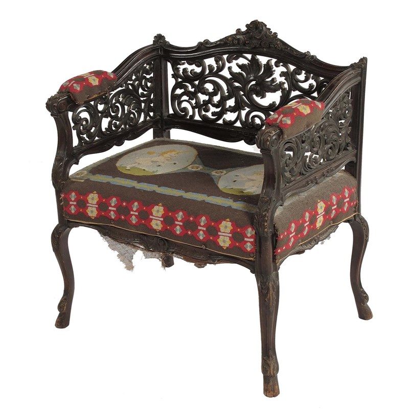 A late Victorian mahogany low armchair, the pierced back and sides carved with scrolling foliage, the tapestry seat with two unicorns on cabriole legs and stylized hoof feet.