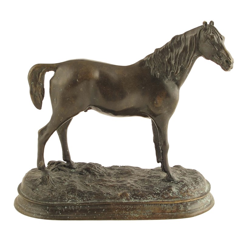 A bronze model of an Arabian horse, standing on an naturalistic oblong base, 20th century, 7.75in (19.5cm) h, 8.5in (21.5cm) w, 3.75in (9cm) d.