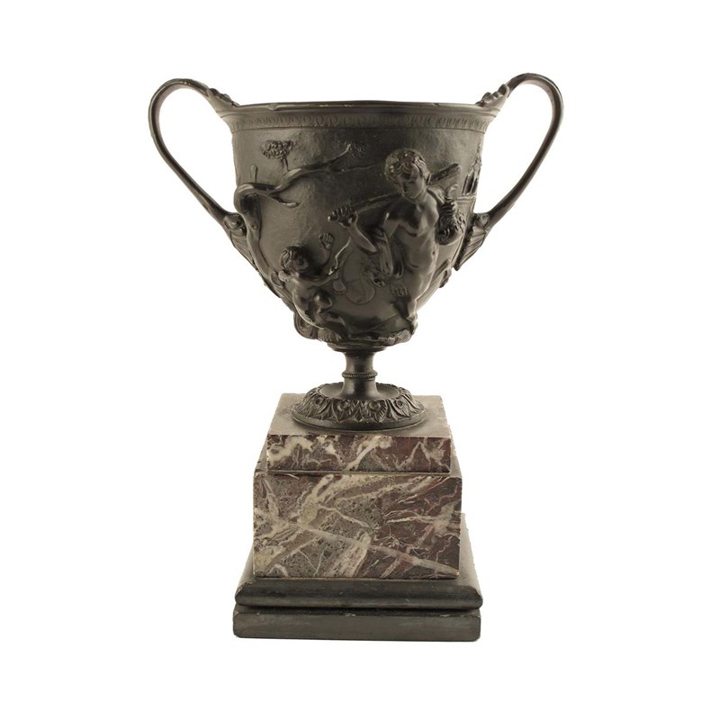 A 19th century Italian bronze two handled vase, modelled in relief with two centaurs and putti in architectural and wooded landscapes, on a stepped marble and slate plinth base, 8in (20.2cm) h, 6.5in (16.5cm) w, 4.5in (11.3cm) d.