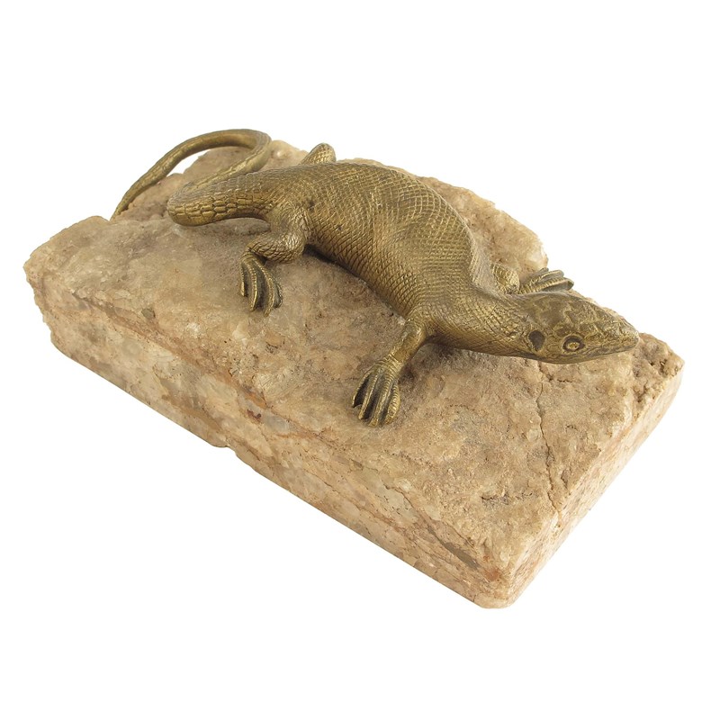 A gilt bronze model of a lizard, mounted on a mineral specimen, c.1900, 1.75in (4.3cm) h, 5.5in (14cm) w, 3.25in (81cm) d.