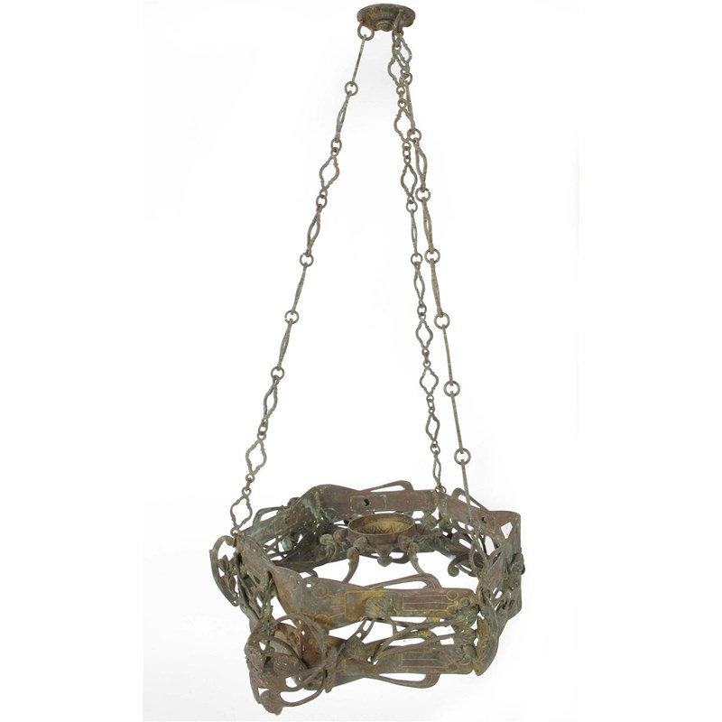 A patinated brass Art Nouveau hanging ceiling light, with an open hexagonal frame with applied bud branches two forming holders, one missing, with a link chain support, 29in (74cm) h, 18.5in (47cm) w.